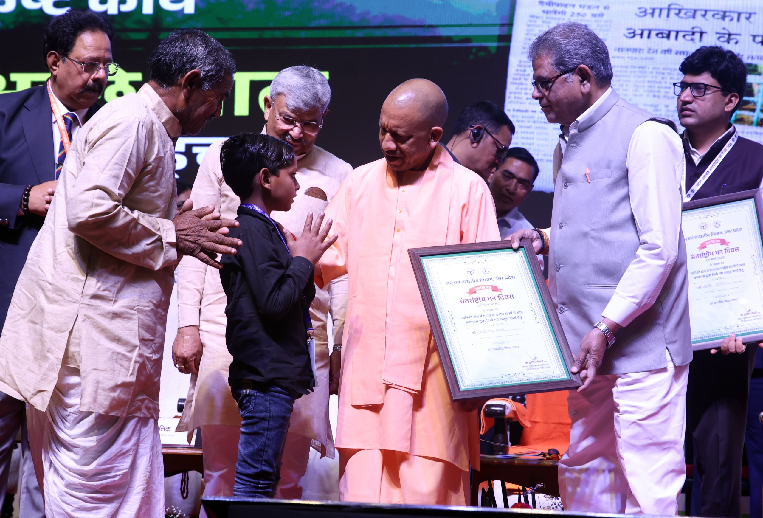 सीएम ने बहराइच के 10 वर्षीय अच्छेलाल व प्रयागराज की तनु सिंह (18) को सम्मानित किया। अच्छेलाल 06 दिसम्बर 2025 को सायं 7 बजे अपने पिता के साथ साइकिल से खेत से वापस घर जा रहा था। इस दौरान रास्ते में अचानक गन्ने के खेत से तेंदुआ ने हमला कर दिया। तेंदुआ से मुकाबला करते हुए अच्छे लाल ने बहादुरी का परिचय देते हुए खुद को बचाया, जिससे हतोत्साहित होकर तेंदुआ भाग गया। इसी प्रकार 8 जनवरी 2026 को झूंसी क्षेत्र के अंतर्गत ग्राम छिवैया में रतन सिंह के घर में अचानक तेंदुआ घुस गया। कमरे में उपस्थित तनु सिंह ने साहस और सूझ-बूझ का परिचय दिया। तनु ने अपने साथ दो छोटे बच्चों को बाहर निकाला और तेंदुआ को कमरे में बन्द कर दिया, जिससे बिना जनहानि के तेंदुआ को सुरक्षित रेस्क्यू किया गया।