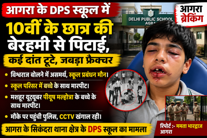 आगरा के सिकंदरा थाना क्षेत्र स्थित DPS स्कूल में एक 10वीं के छात्र के साथ बेरहमी से मारपीट का मामला सामने आया है। हमले में छात्र के कई दांत टूट गए हैं और उसके जबड़े में फ्रैक्चर बताया जा रहा है। घायल छात्र विश्वराज फिलहाल बोलने में असमर्थ है