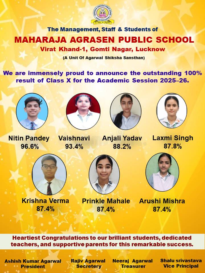 केंद्रीय माध्यमिक शिक्षा बोर्ड द्वारा घोषित 10वीं कक्षा के परीक्षा परिणाम में महाराजा अग्रसेन पब्लिक स्कूल के विद्यार्थियों ने शानदार प्रदर्शन किया। विद्यालय का परीक्षा परिणाम शत-प्रतिशत रहा, जिससे छात्रों और अभिभावकों में खुशी की लहर दौड़ गई।