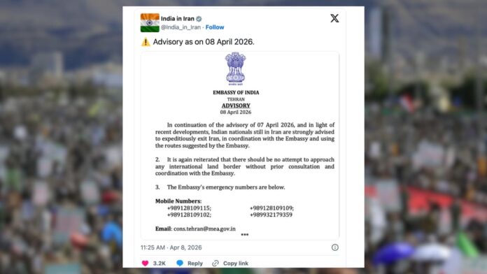 बुधवार, 8 अप्रैल को जारी इस एडवाइजरी में कहा गया है कि हालात को देखते हुए सभी भारतीय नागरिक सुरक्षित और सुझाए गए रास्तों से ही ईरान से बाहर निकलें और किसी भी यात्रा से पहले दूतावास के संपर्क में जरूर रहें।