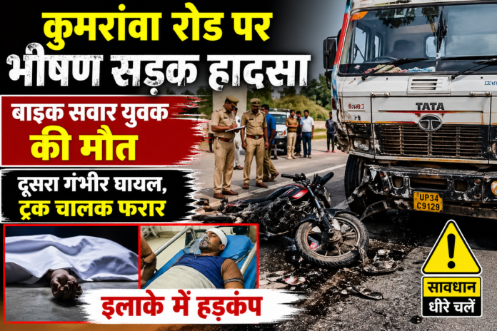 राजधानी लखनऊ के Itaunja थाना क्षेत्र में सोमवार सुबह एक दर्दनाक सड़क हादसा हो गया। कुमरांवा रोड स्थित सोनारन पुरवा के पास ट्रक और बाइक की आमने-सामने टक्कर में एक युवक की मौके पर ही मौत हो गई, जबकि दूसरा गंभीर रूप से घायल हो गया।