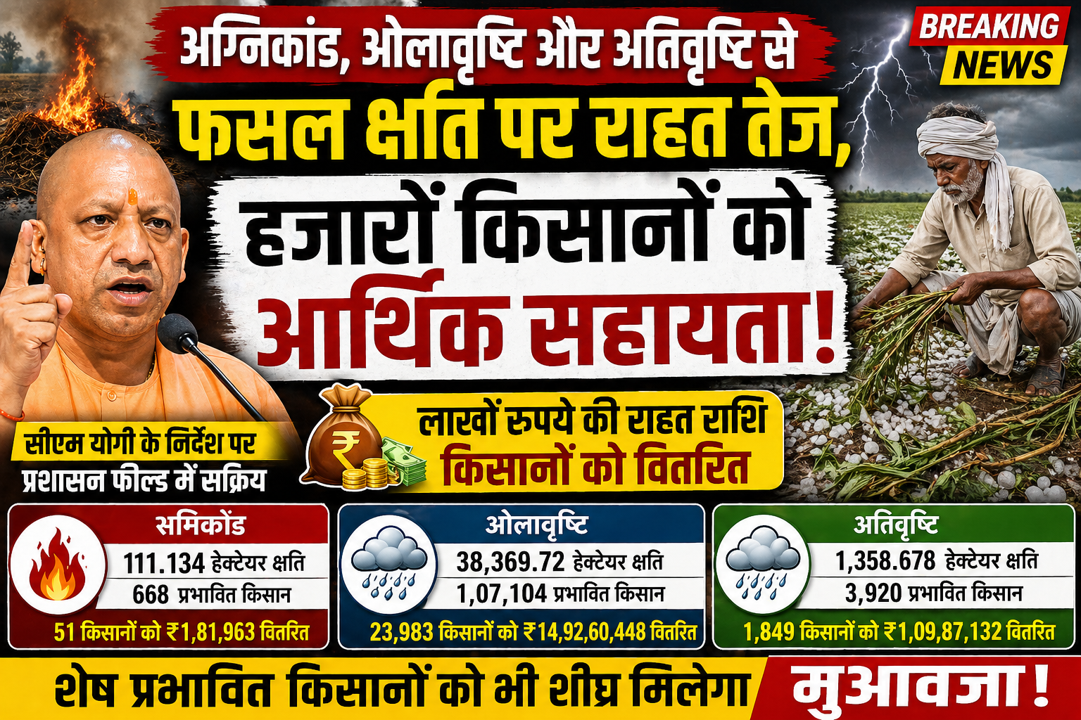 लखनऊ। मुख्यमंत्री Yogi Adityanath के निर्देश पर उत्तर प्रदेश सरकार ने अग्निकांड, ओलावृष्टि और अतिवृष्टि से प्रभावित किसानों को राहत पहुंचाने की प्रक्रिया तेज कर दी है। प्रशासन को फील्ड में सक्रिय रहते हुए फसल क्षति का त्वरित आकलन और सहायता वितरण सुनिश्चित करने के निर्देश दिए गए हैं, ताकि कोई भी किसान मदद से वंचित न रह जाए।