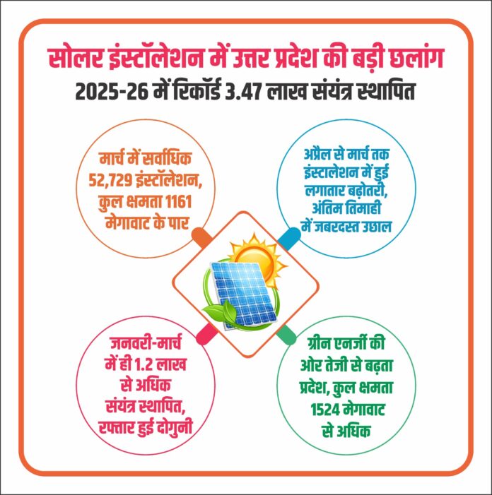 उत्तर प्रदेश ने वित्तीय वर्ष 2025-26 में सोलर ऊर्जा के क्षेत्र में रिकॉर्ड प्रदर्शन करते हुए 3,47,729 रूफटॉप सोलर संयंत्र स्थापित किए हैं। इस दौरान राज्य की कुल स्थापित क्षमता 1161.756 मेगावाट तक पहुंच गई, जो ग्रीन एनर्जी की दिशा में प्रदेश की तेज प्रगति को दर्शाता है।